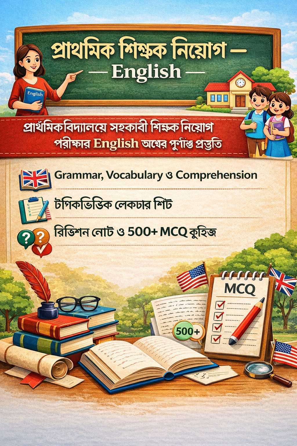 প্রাথমিক বিদ্যালয়ে সহকারী শিক্ষক নিয়োগ পরীক্ষার English অংশের পূর্ণাঙ্গ প্রস্তুতি। Grammar, Vocabulary ও Comprehension — টপিকভিত্তিক লেকচার শিট, রিভিশন নোট ও ৫০০+ MCQ কুইজ।